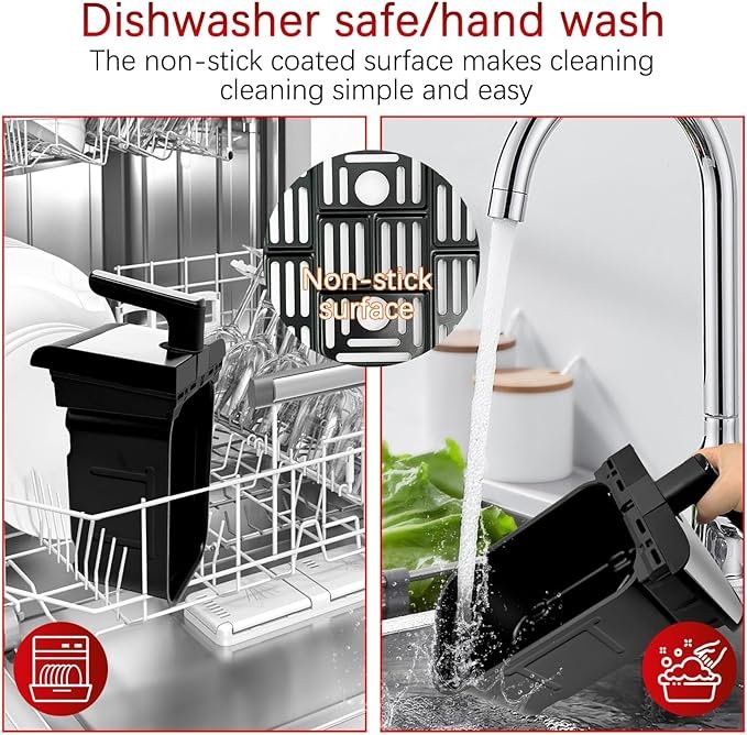 Los cajones se extraen fácilmente y su revestimiento antiadherente permite limpiar con un paño o esponja suave. Nada se queda pegado, y los residuos de grasa se limpian sin esfuerzo. La carcasa exterior requiere solo un paño húmedo. En comparación con freidoras tradicionales, ahorra tiempo y trabajo.