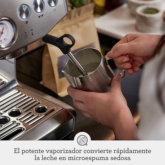 Es una cafetera espresso semiprofesional diseñada para quienes quieren reproducir en casa la experiencia de una cafetería especializada. Integra molinillo cónico, sistema de dosificación automática y apisonado asistido, eliminando varios de los errores comunes al preparar espresso manualmente. Su sistema Impress Puck ayuda a compactar el café con presión constante, algo que normalmente requiere experiencia de barista. El resultado es una máquina que reduce la curva de aprendizaje sin sacrificar control sobre el proceso.